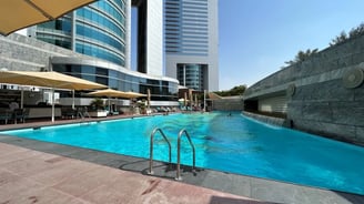 The swimming pool at Jumeirah Emirates Towers offers a serene retreat with stunning city views, lush greenery, and premium poolside service. Guests can relax on sunbeds, enjoy refreshing drinks, and unwind in a luxurious, tranquil setting in the heart of Dubai.